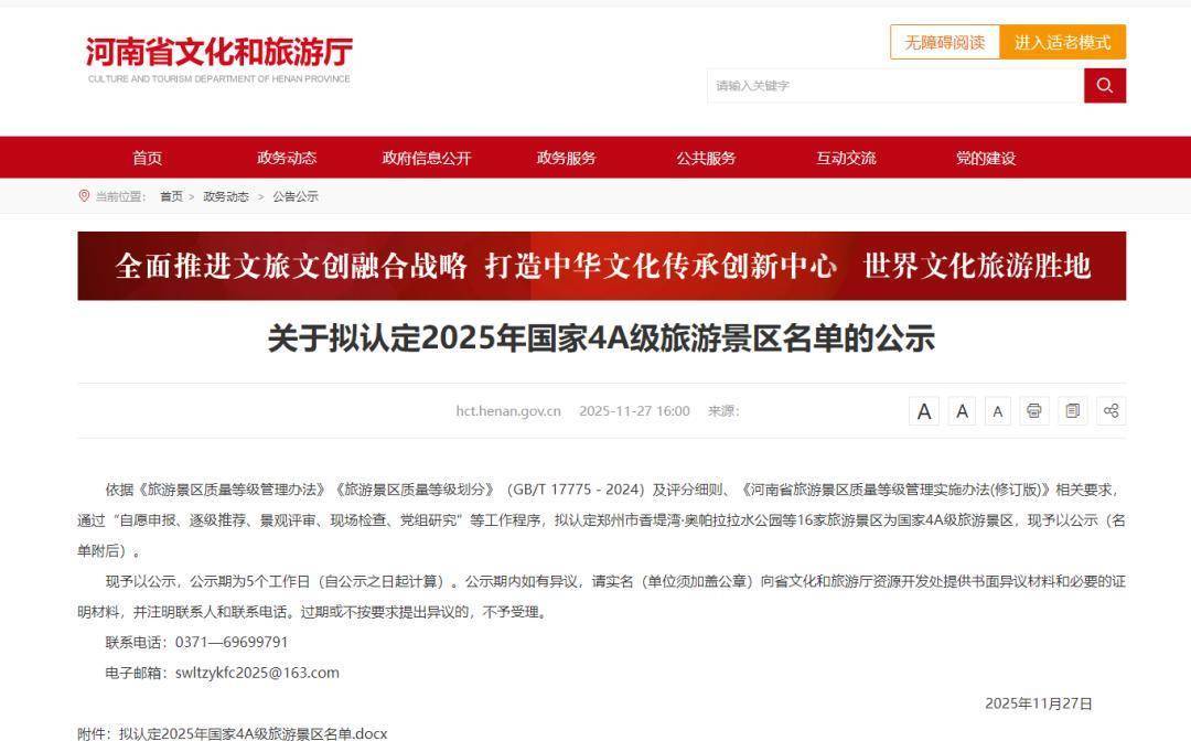 公告显示,依据《旅游景区质量等级管理办法》《旅游景区质量等级划分》(GB/T 17775-2024)及评分细则、《河南省旅游景区质量等级管理实施办法(修订版)》相关要求,通过“自愿申报、逐级推荐、景观评审、现场检查、党组研究”等工作程序,最终形成上述评定结果。拟认定2025年国家4A级旅游景区名单郑州市:香堤湾·奥帕拉拉水公园