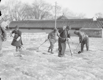 采冰对冰源的水质有要求,只有水质干净的河流,出产的冰块才干净卫生。清代采冰多在京城周边的护城河,城内的积水潭、什刹海与北海、中海、南海等河湖。每年立冬后采冰之前,首先要“涮河”,捞去水草杂物,开上游闸门放水冲刷后,再关下游闸门蓄水,使水面上涨饱满,冻成的冰晶莹剔透且坚硬厚实。采冰时,首先要祭祀河神,然后在冬至那天开始采冰。采冰一般在夜间进行,因为夜间结的冰结实易保存。采冰工人穿着皮袄、皮裤还有防滑保暖的靰鞡,在冰面上按照每块冰方正一尺五寸的标准,用冰镩横平竖直地一排排、一行行画出界线,依画好的线把冰镩下来。镩冰是个技术活儿,镩下来的冰块要方正,不能有大有小,不能破边。采冰工人将采好的冰块拖至岸边,装上大车以最快速度运到冰窖储藏,封门以待夏天取用。